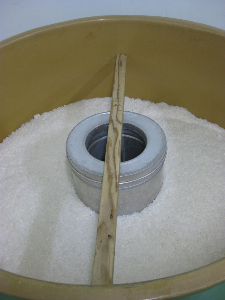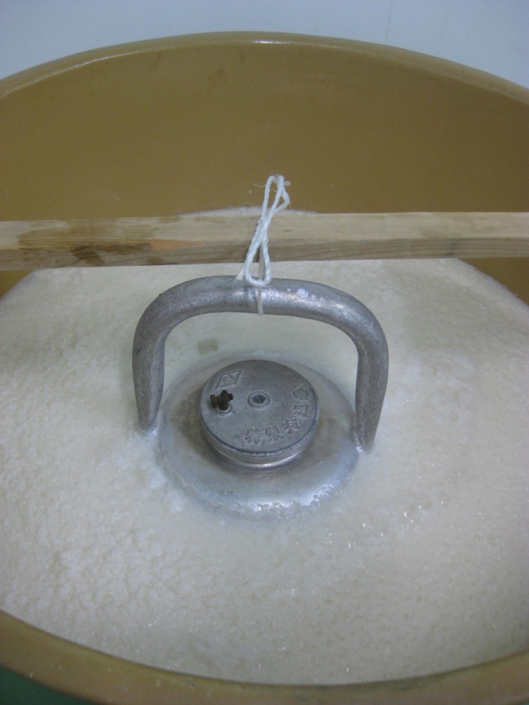 暖気樽(だきだる)というお湯の入った樽を入れ、酛を暖めて酵母の気持ちのいい温度にしてやります。