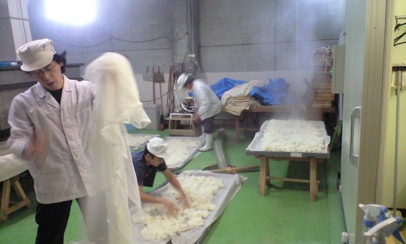 今朝も昨日麹室(こうじむろ)の中に引き込まれた蒸米が