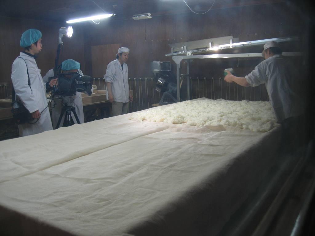 お酒のことを考えると、どうしても待てず、撮影の途中でコソコソ入り込んで蒸米を撮影中の床(とこ・右写真の台)にドカドカ盛っていきました (´曲`;)