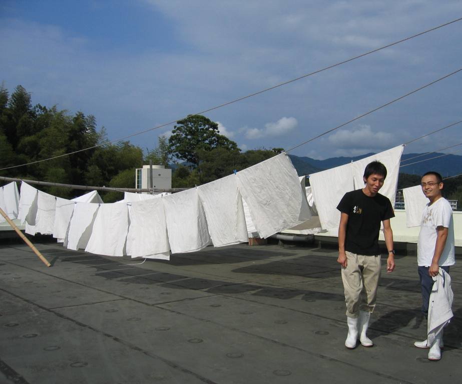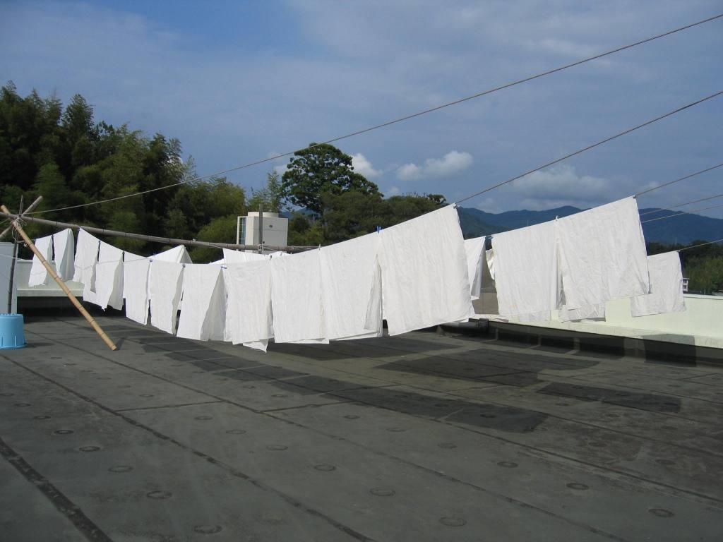 造りで使用する布を洗濯して屋上に干しております。