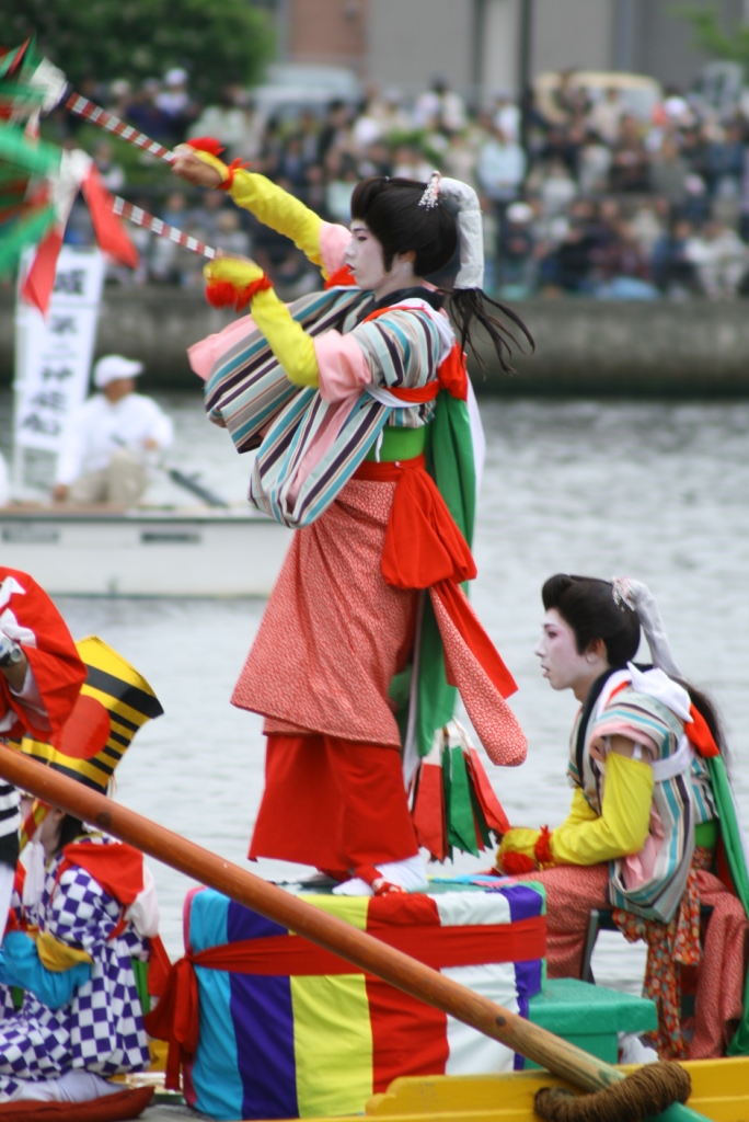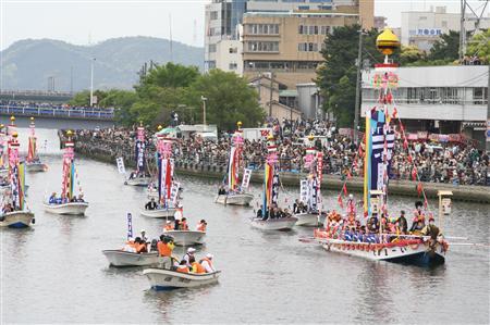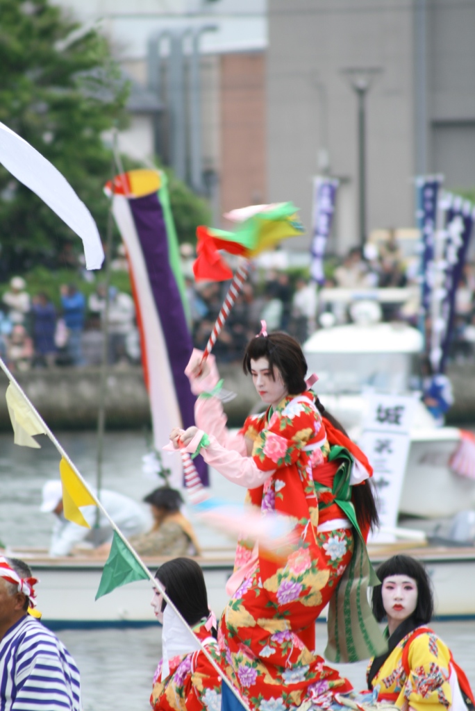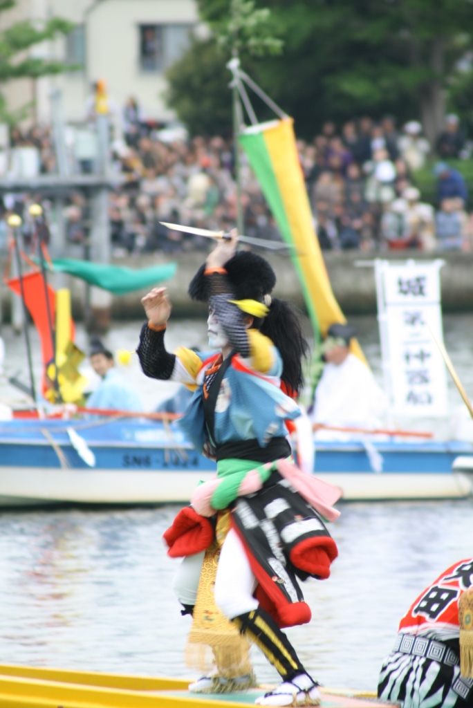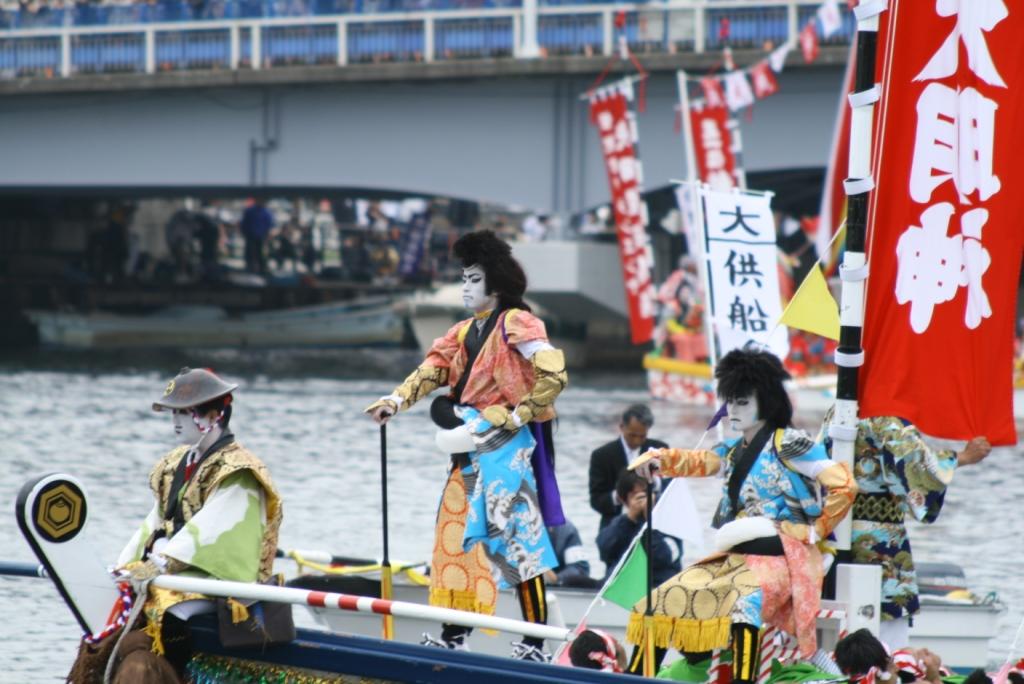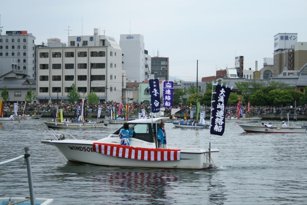 さて、大橋川に出る船は、神輿船一隻と、5地区から一隻ずつ櫂伝馬船(かいでんません)が出ます。