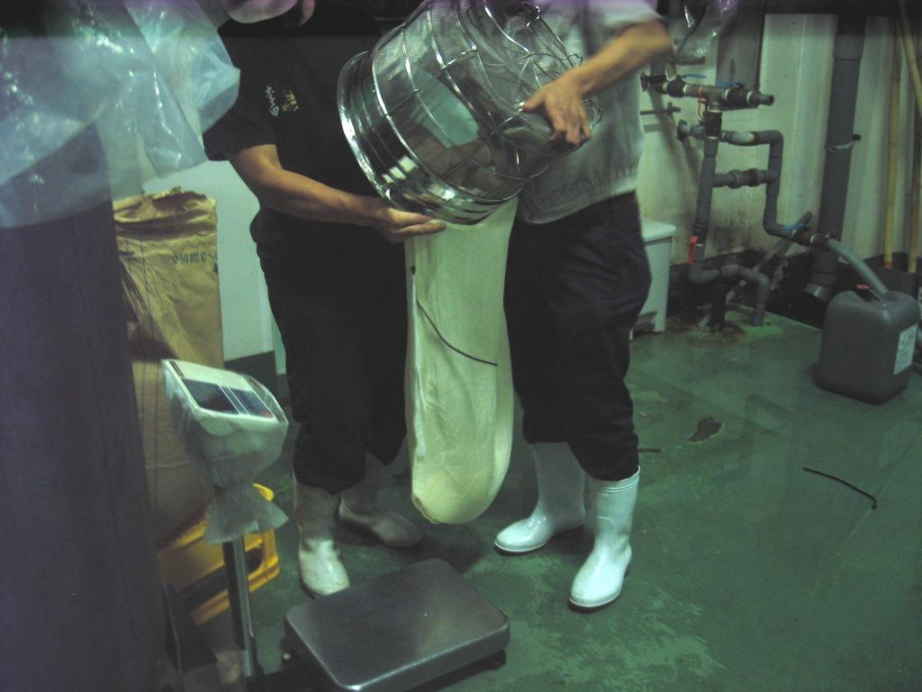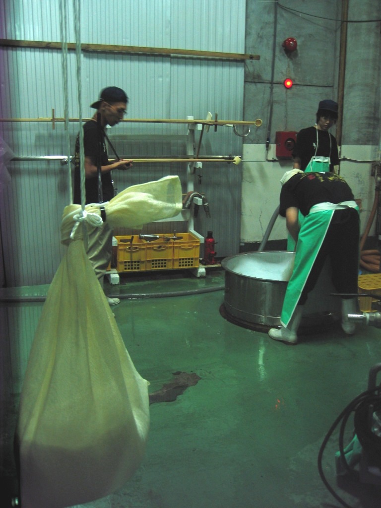 ジャバラ部分で搾り、搾ったお酒は手前の小さなタンクに入ります。